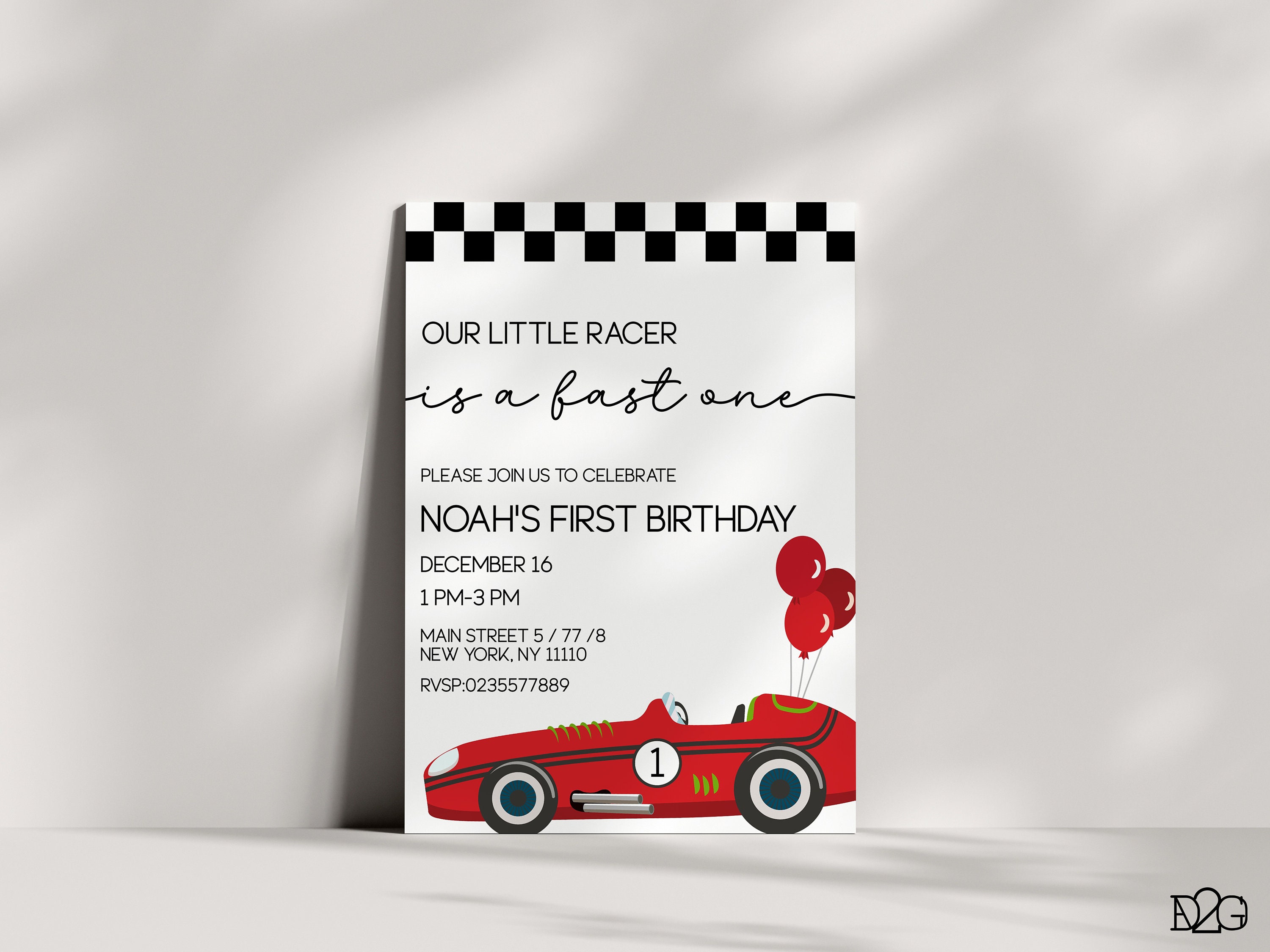 Rev up the engines and get ready for an unforgettable celebration with our race car birthday invitation! The design is all about the exciting race and features bright colors that will make your speed racer's heart beat faster with excitement. Our easy-to-use online editor allows you to easily add your own details and information, so you can get your invitations printed and sent out quickly and hassle-free.