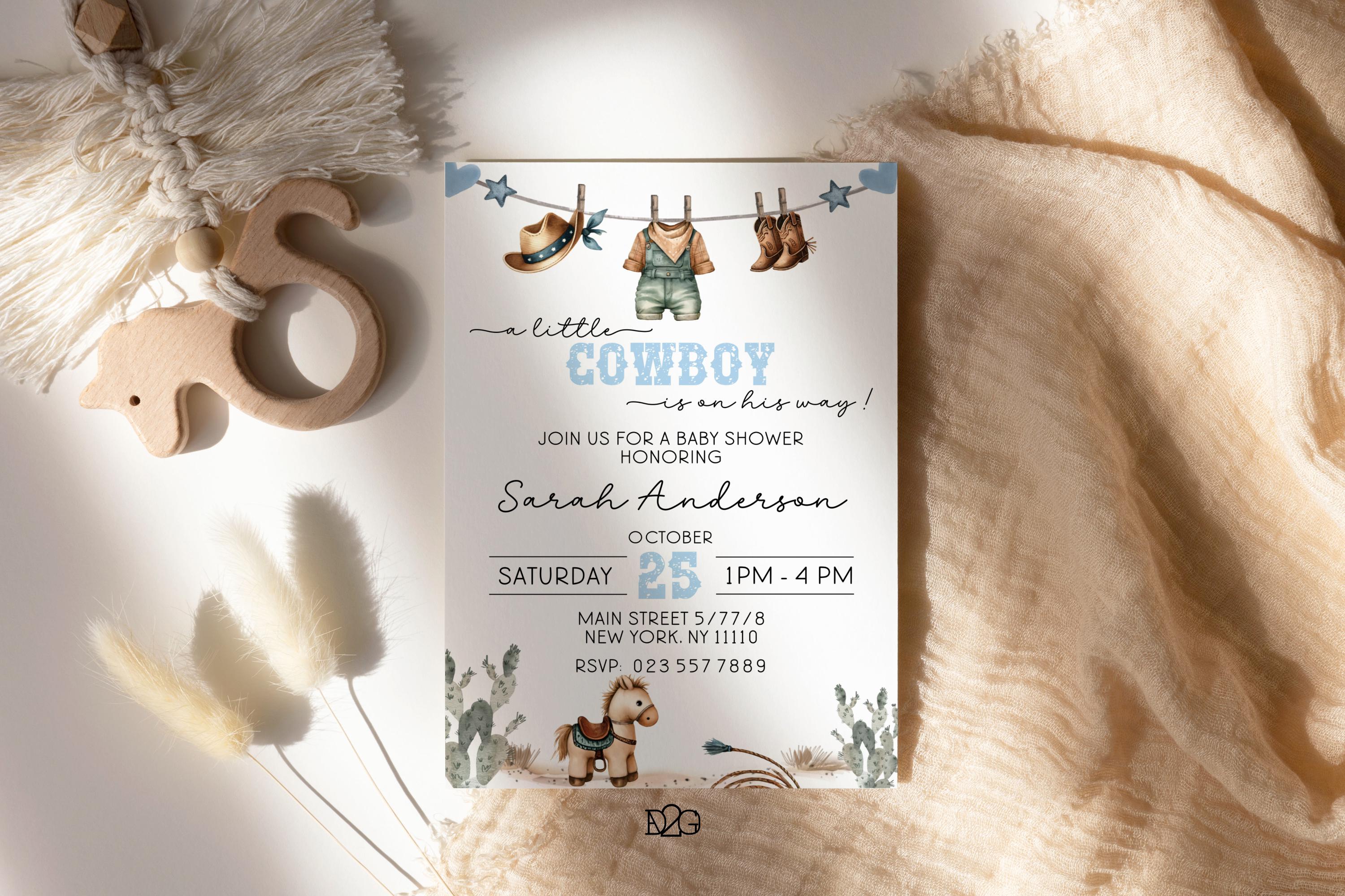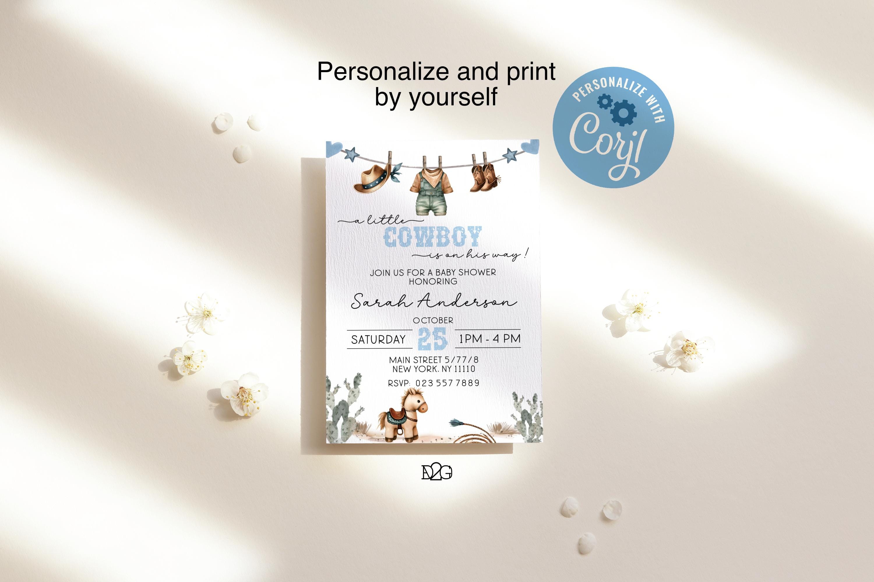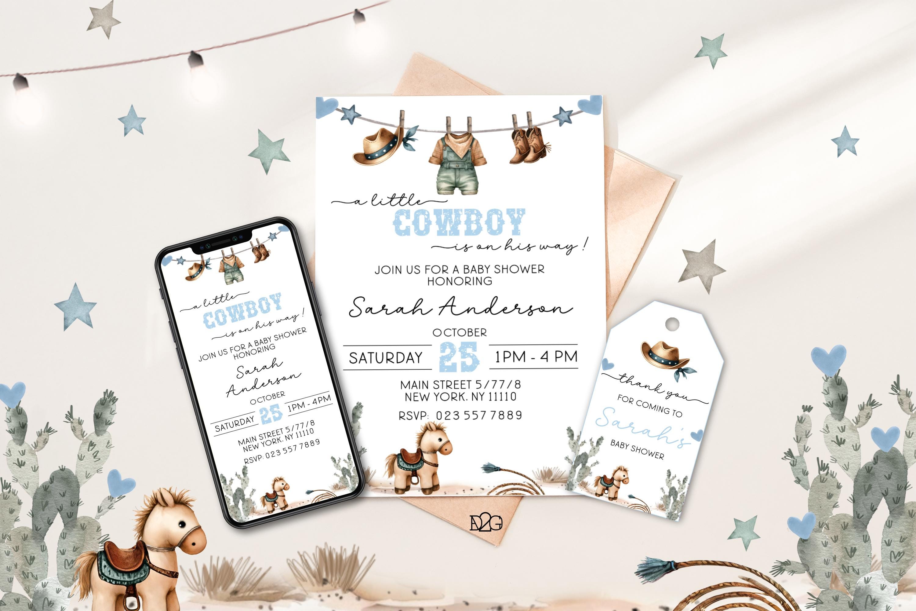 Celebrate the arrival of your little cowboy with our personalized and printable western baby shower invitation! This charming blue baby shower set captures the spirit of the Wild West and can be customized with your details for a unique touch. It also includes a digital invitation for smartphones and a matching gift tag for a consistent look at your celebration. It is easy to personalize with corjl, download, and print. it's perfect for busy parents! Make your baby shower unforgettable with this delightful boy baby shower invitation set.