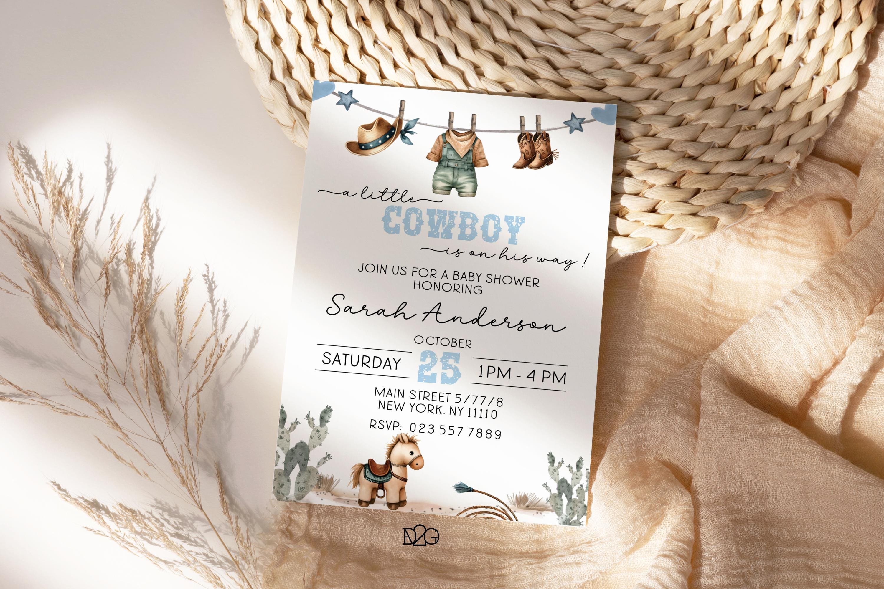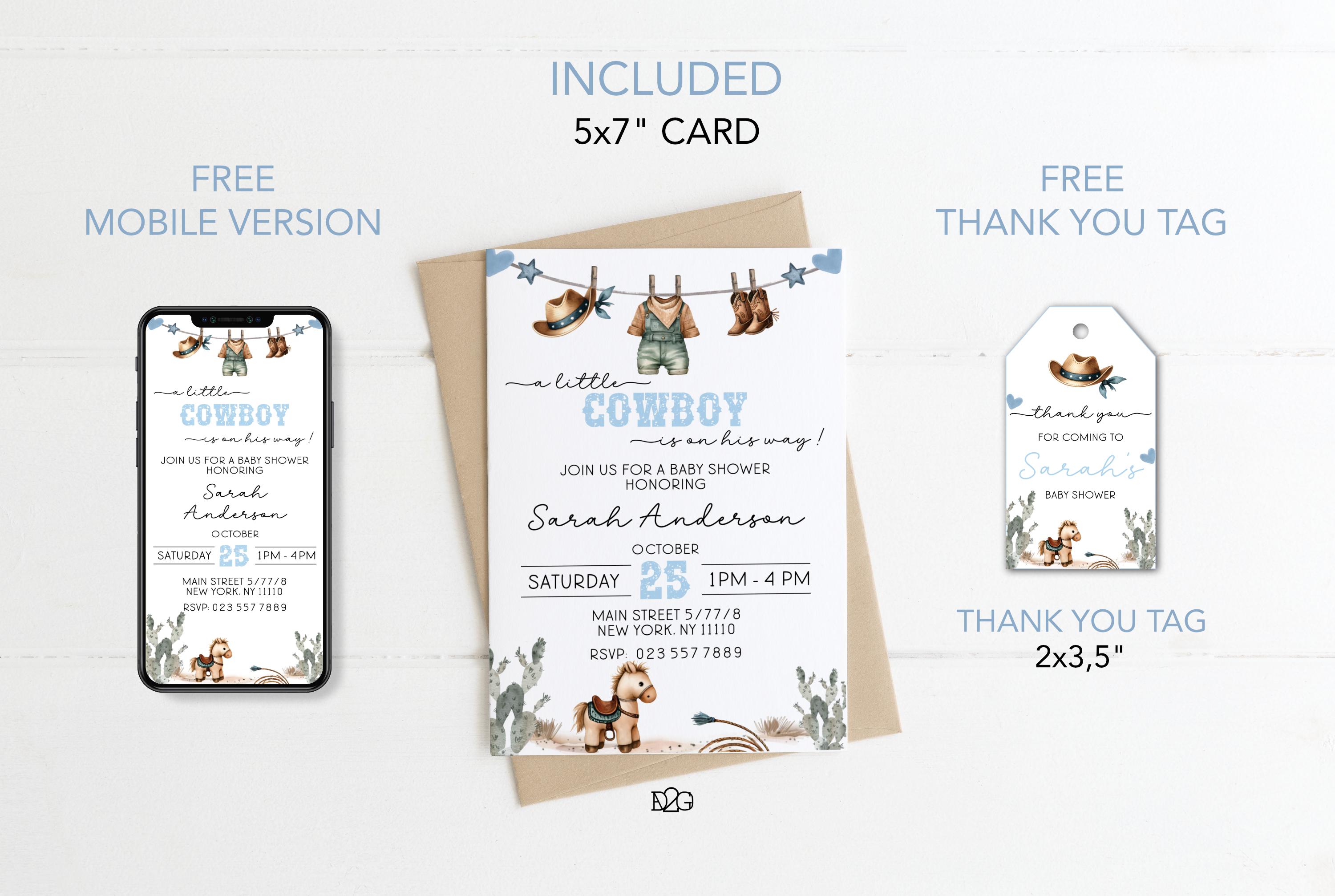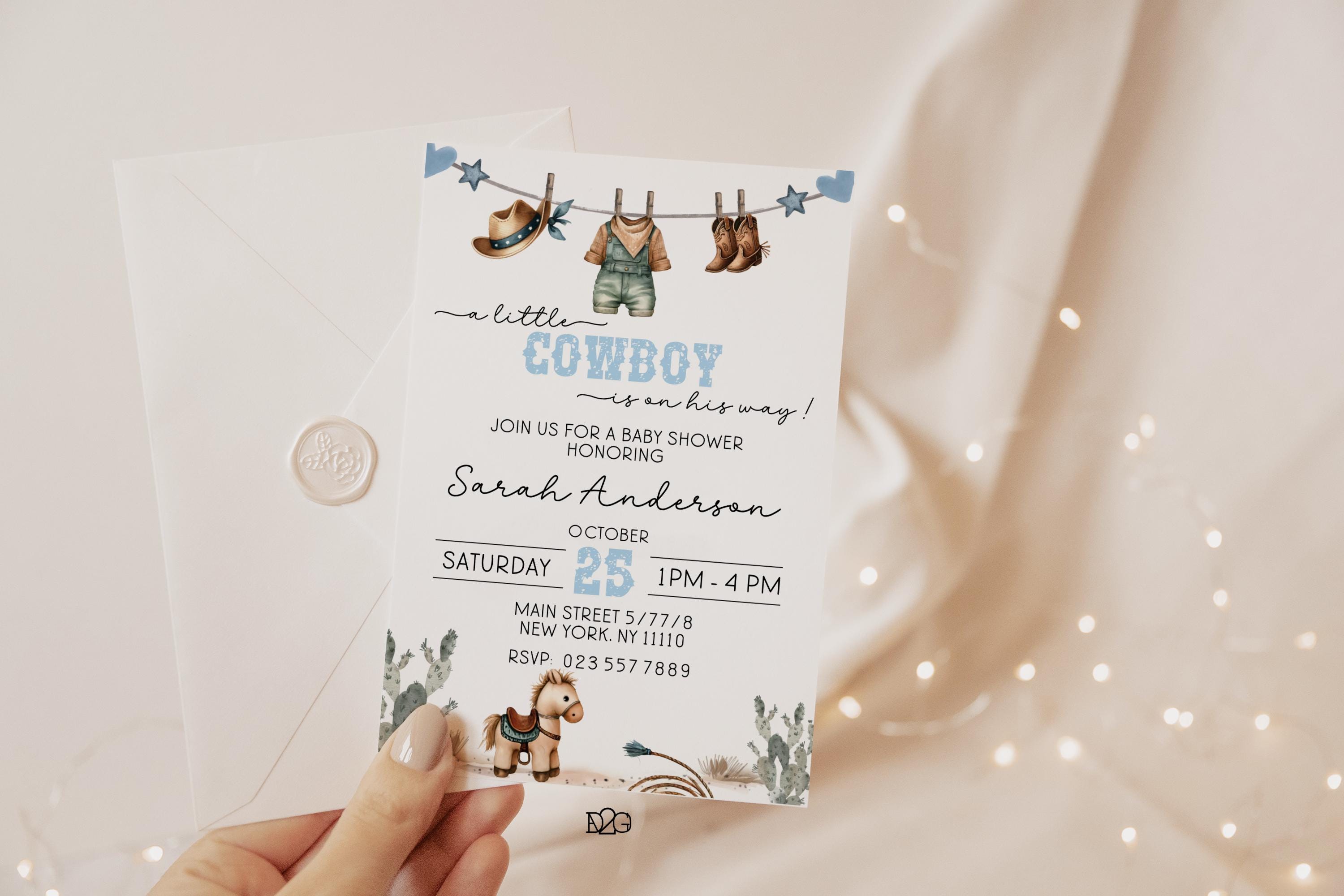 Celebrate the arrival of your little cowboy with our personalized and printable western baby shower invitation! This charming blue baby shower set captures the spirit of the Wild West and can be customized with your details for a unique touch. It also includes a digital invitation for smartphones and a matching gift tag for a consistent look at your celebration. It is easy to personalize with corjl, download, and print. it's perfect for busy parents! Make your baby shower unforgettable with this delightful boy baby shower invitation set.