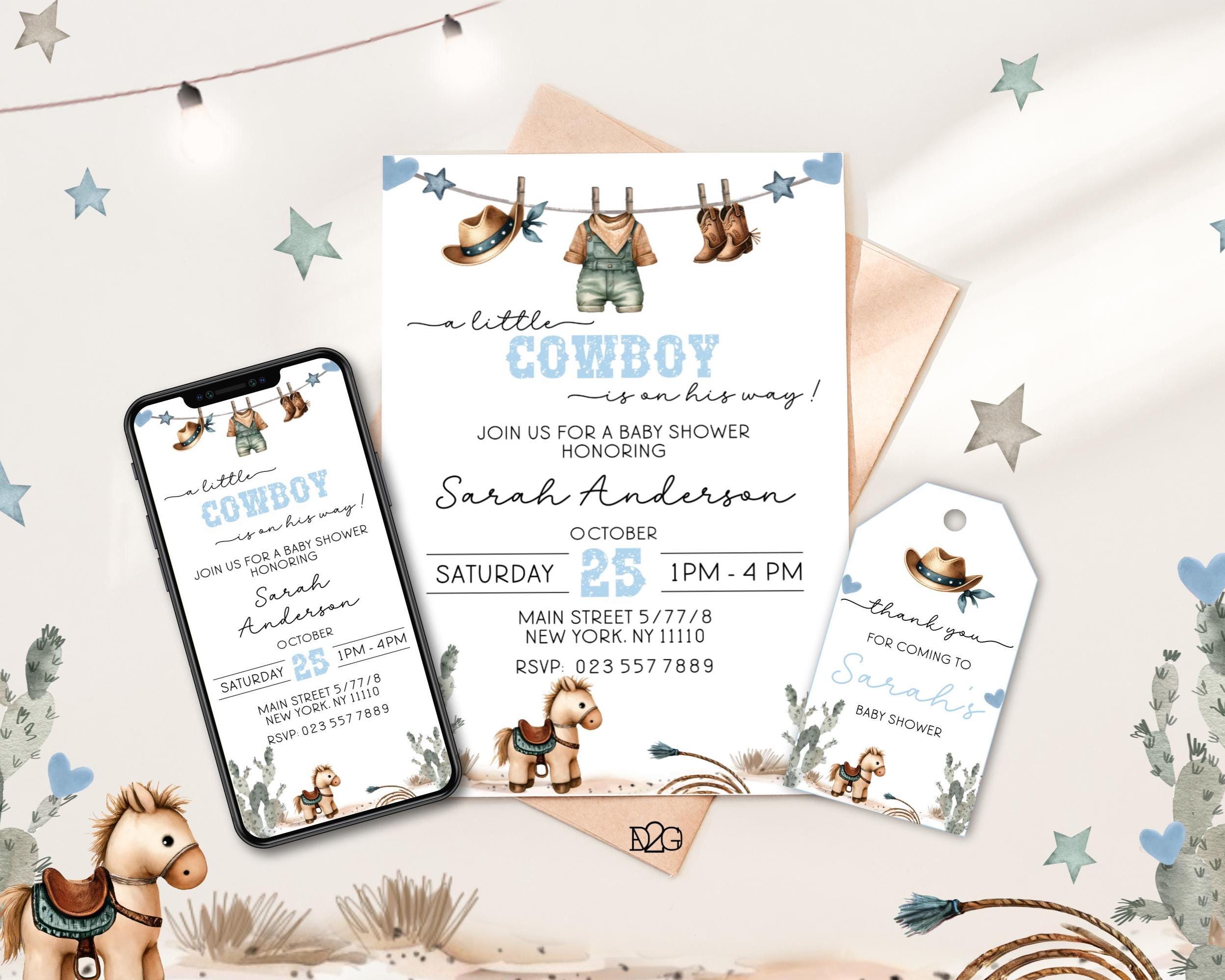 Celebrate the arrival of your little cowboy with our personalized and printable western baby shower invitation! This charming blue baby shower set captures the spirit of the Wild West and can be customized with your details for a unique touch. It also includes a digital invitation for smartphones and a matching gift tag for a consistent look at your celebration. It is easy to personalize with corjl, download, and print. it's perfect for busy parents! Make your baby shower unforgettable with this delightful boy baby shower invitation set.