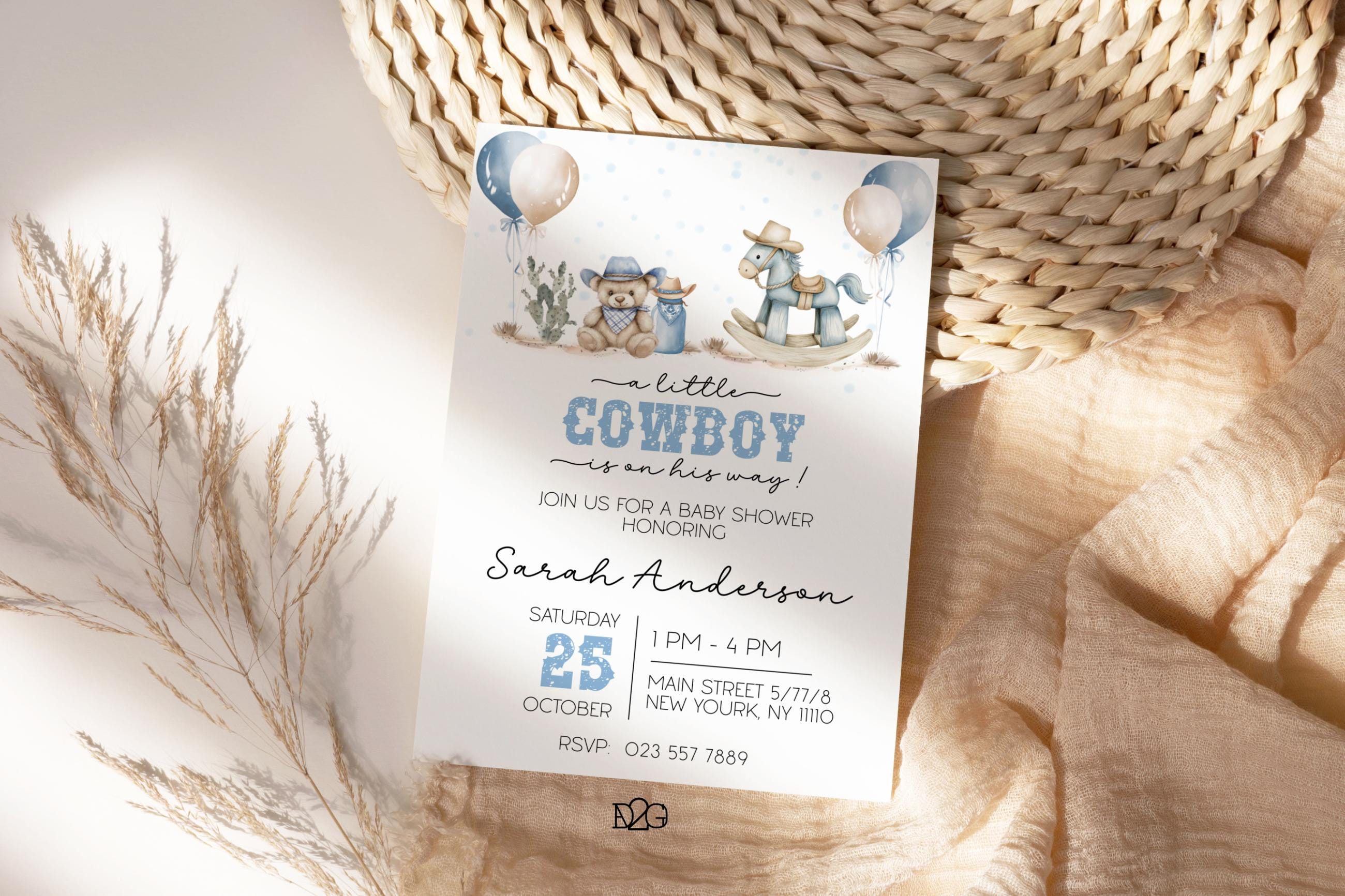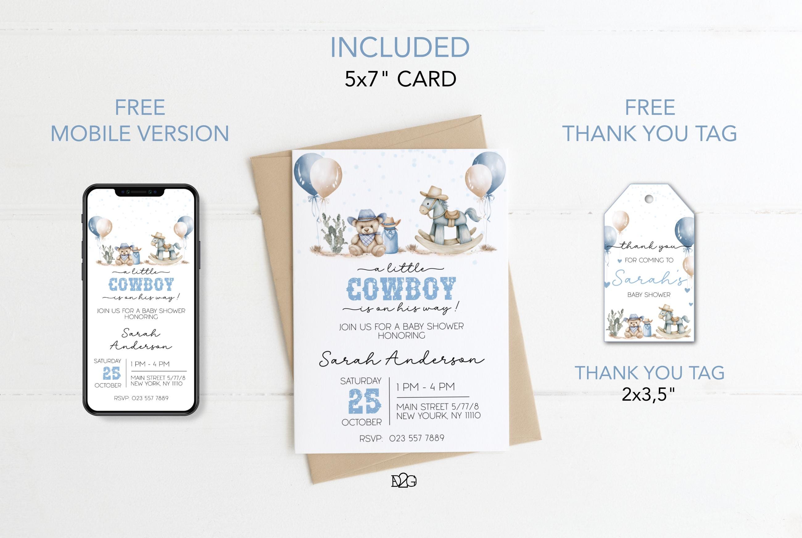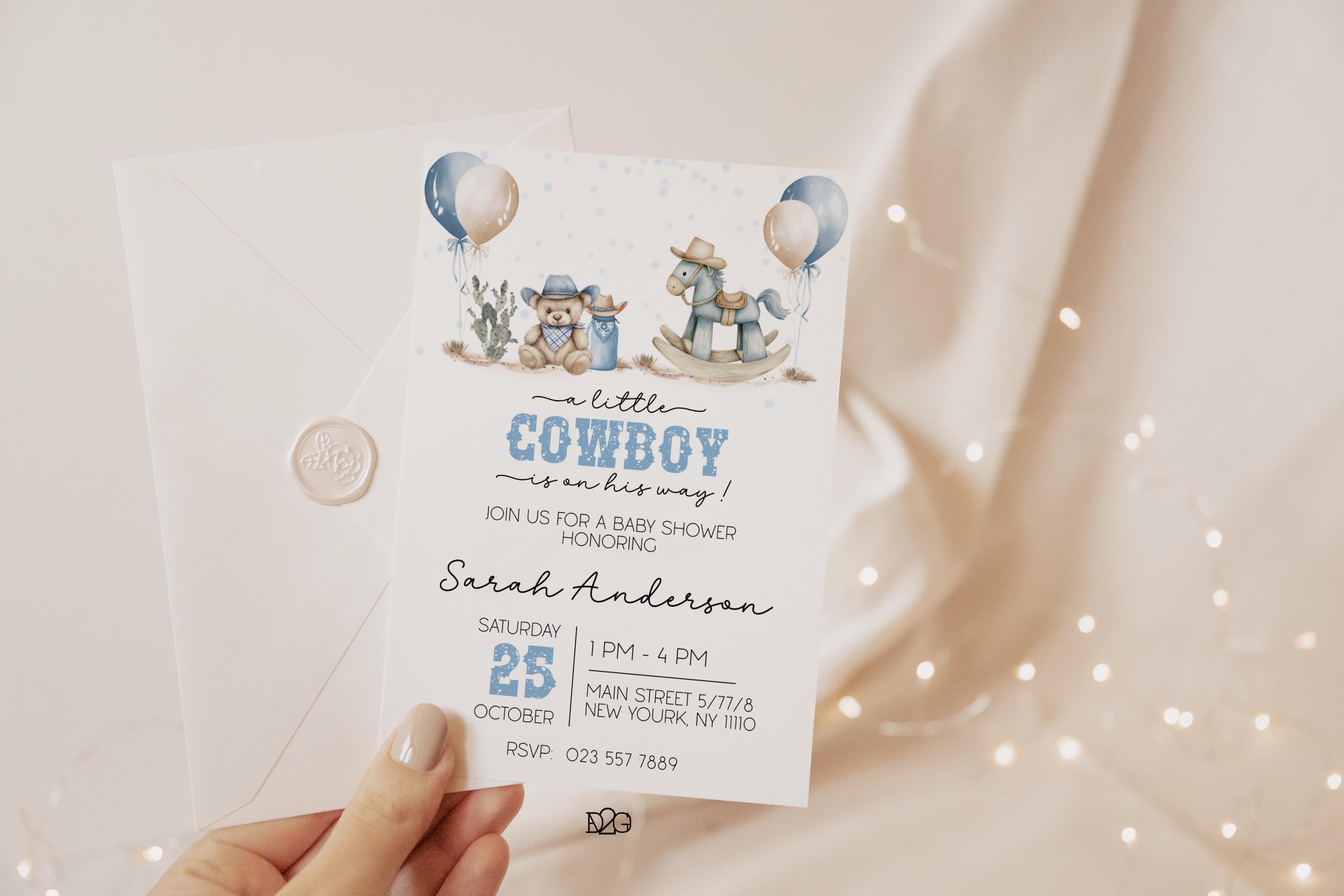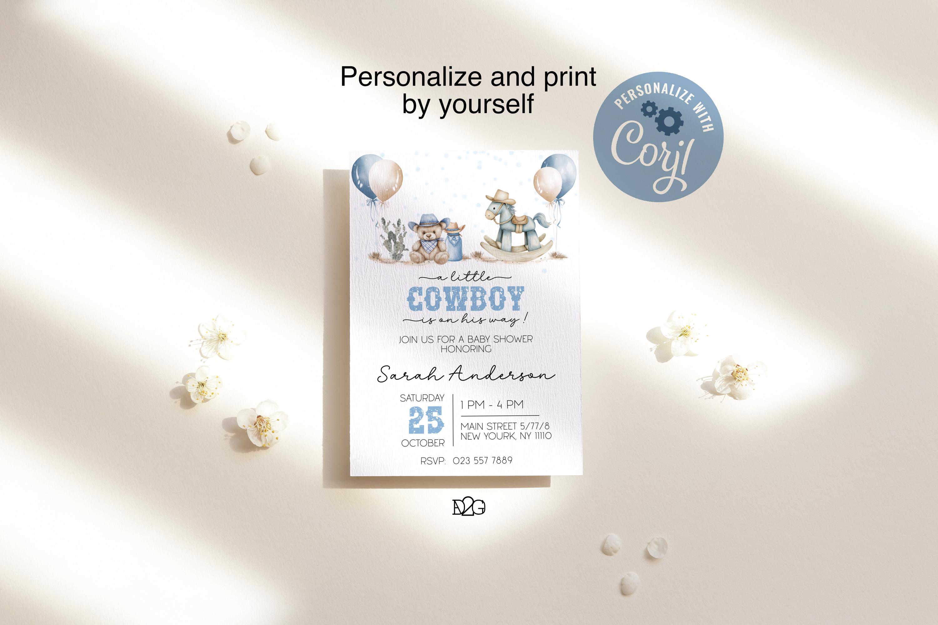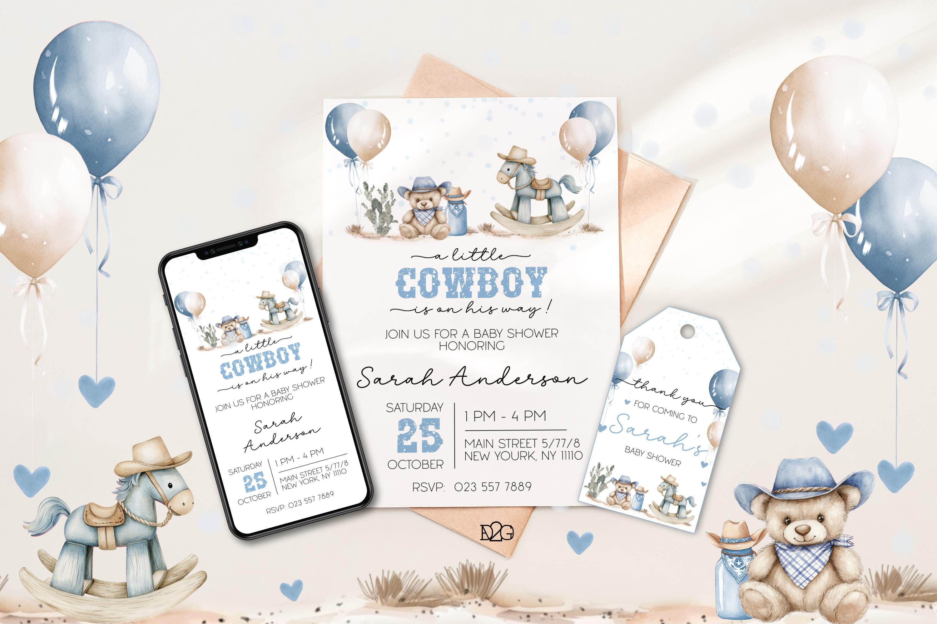 Celebrate the arrival of your little cowboy with our personalized and printable western baby shower invitation! This charming blue baby shower set captures the spirit of the Wild West and can be customized with your details for a unique touch. It also includes a digital invitation for smartphones and a matching gift tag for a consistent look at your celebration. It is easy to personalize with corjl, download and print. It's perfect for busy parents! Make your baby shower unforgettable with this delightful boy baby shower invitation set.