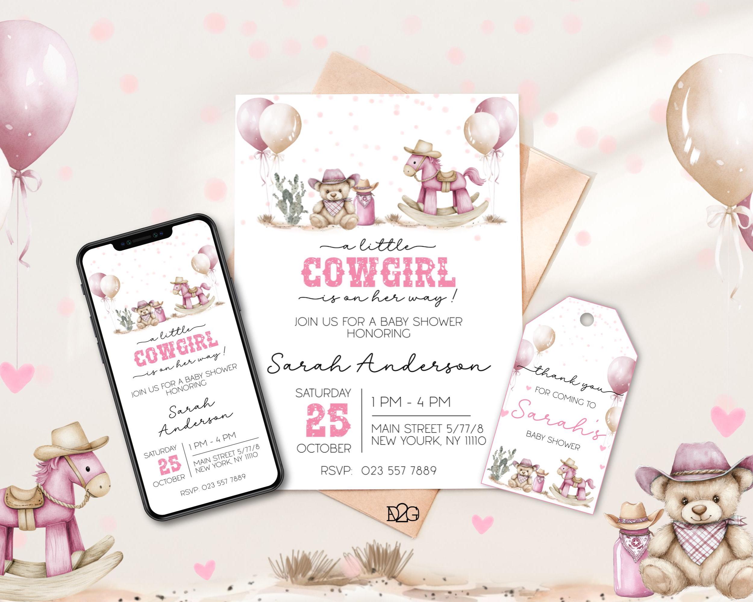 Celebrate the arrival of your little cowgirl with our personalized and printable western baby shower invitation! This charming pink baby shower set captures the spirit of the Wild West and can be customized with your details for a unique touch. It also includes a digital invitation for smartphones and a matching gift tag for a consistent look at your celebration. It is easy to personalize with corjl, download and print. It's perfect for busy parents! Make your baby shower unforgettable with this delightful girl baby shower invitation set.